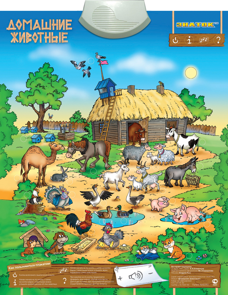Звуковой плакат знакомит детей, как с животными, которых человек приручил, и которые служат человеку. Плакат даёт возможность услышать краткий рассказ об этих животных и услышать их голоса.